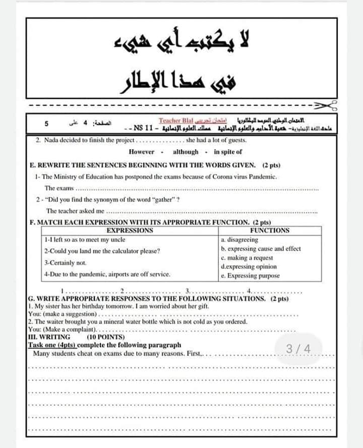 امتحان تجريبي في الانجليزية رقم 3 مع التصحيح